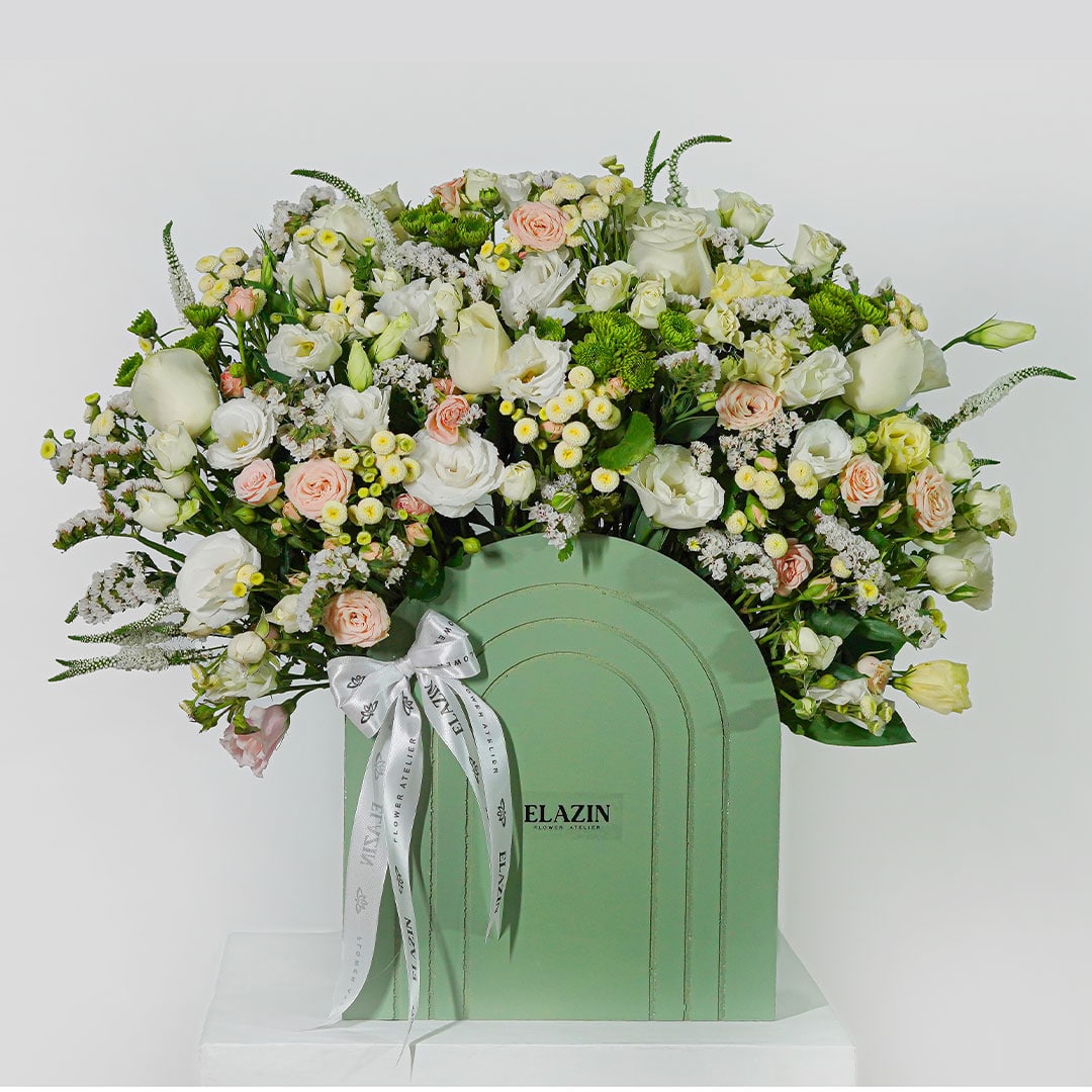 گلهای به کار رفته: رز مینیاتوری، لیسینتوس، مخلصه، رز، ورونیکا
