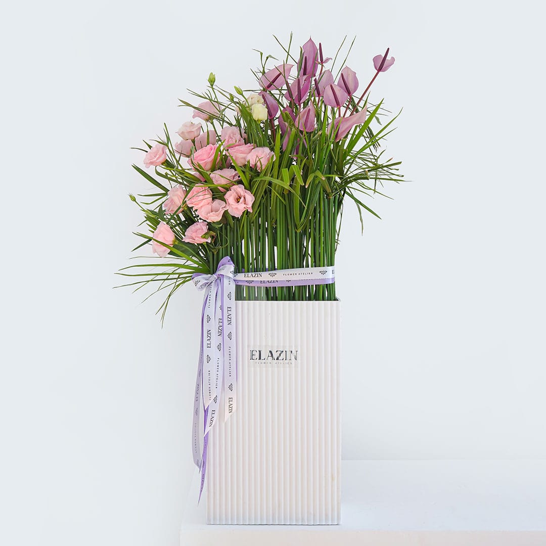 گلهای به کار رفته : آنتریوم، لیسینتوس، رز، نخل مرداب