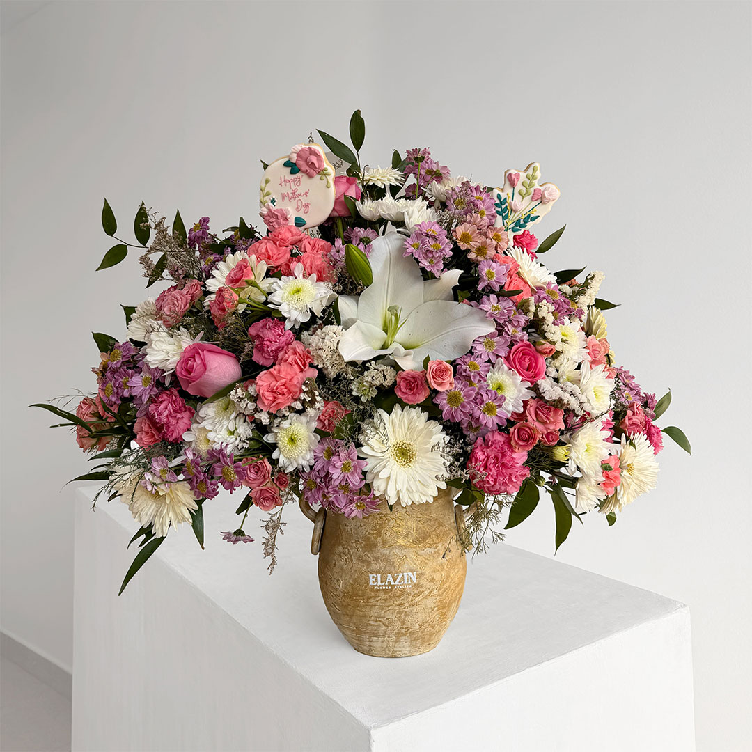 گلهای به کار رفته : اورینتال، رز، رز مینیاتوری، میخک، ژربرا، داوودی بابونه ای، داوودی
